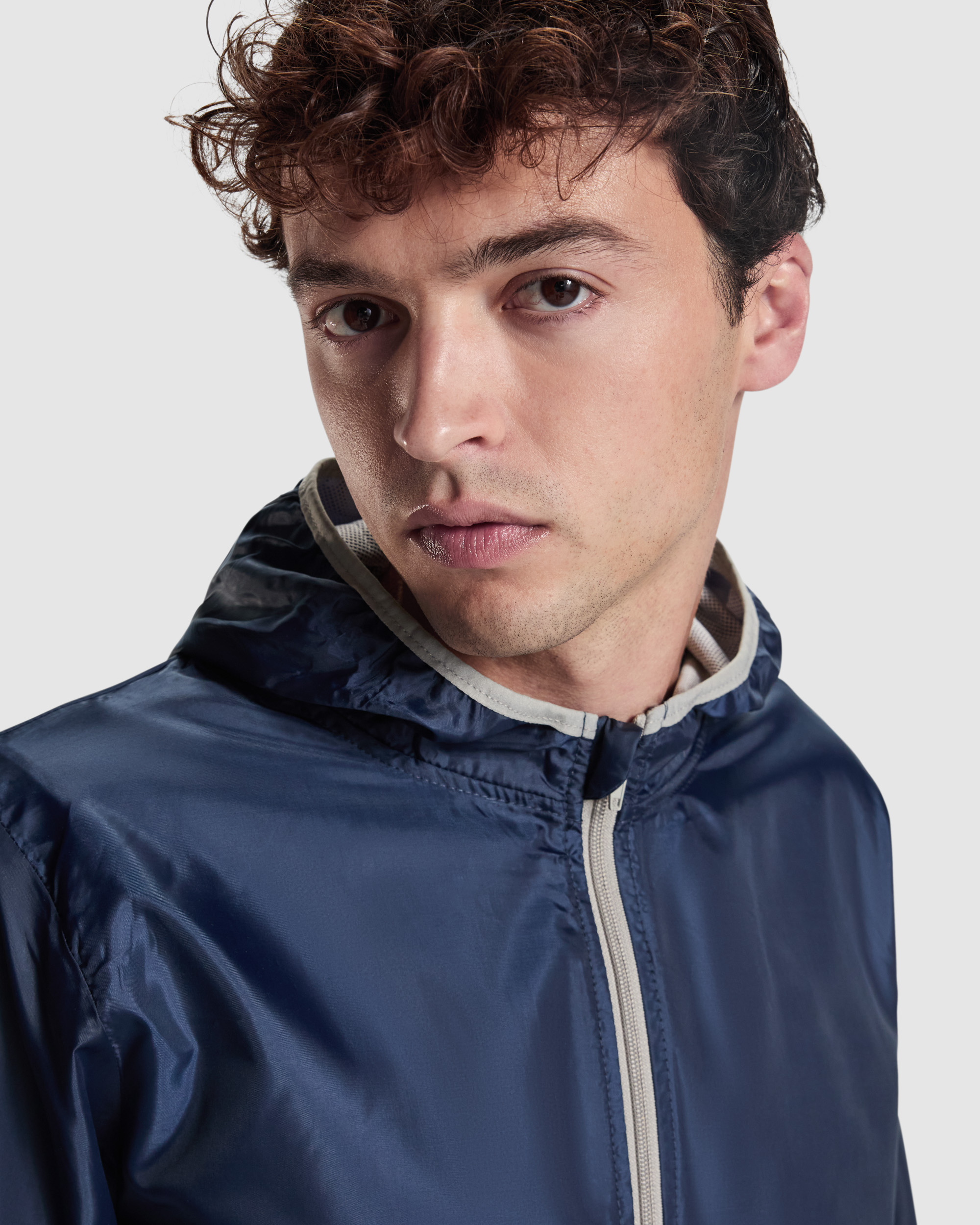 Cortavientos con capucha. Cremallera completa en contraste con protector de barbilla y tirador. Bolsillos delanteros con ribete reflectante. Bolsillo canguro a la espalda para guardar prenda, con cierre de velcro. Mangas y bajo de la prenda con ribete elástico en contraste. Interior de capucha con forro rejilla y cubrecosturas.