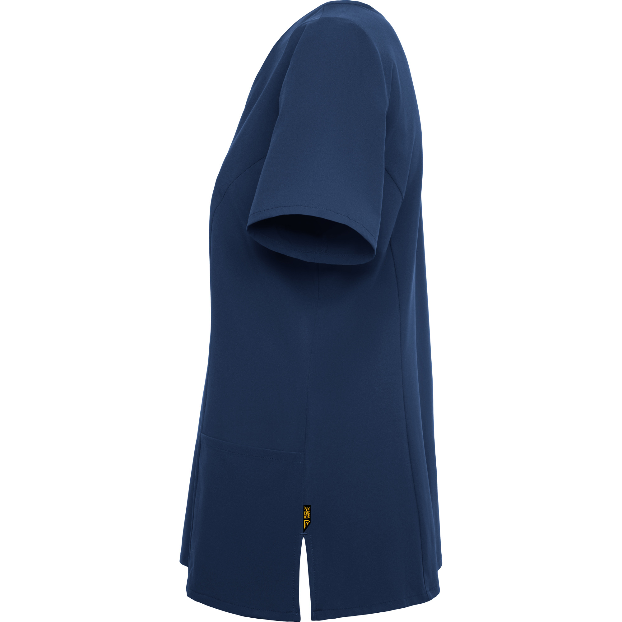 Casaca sanitaria de manga corta con cintura ligeramente ajustada.