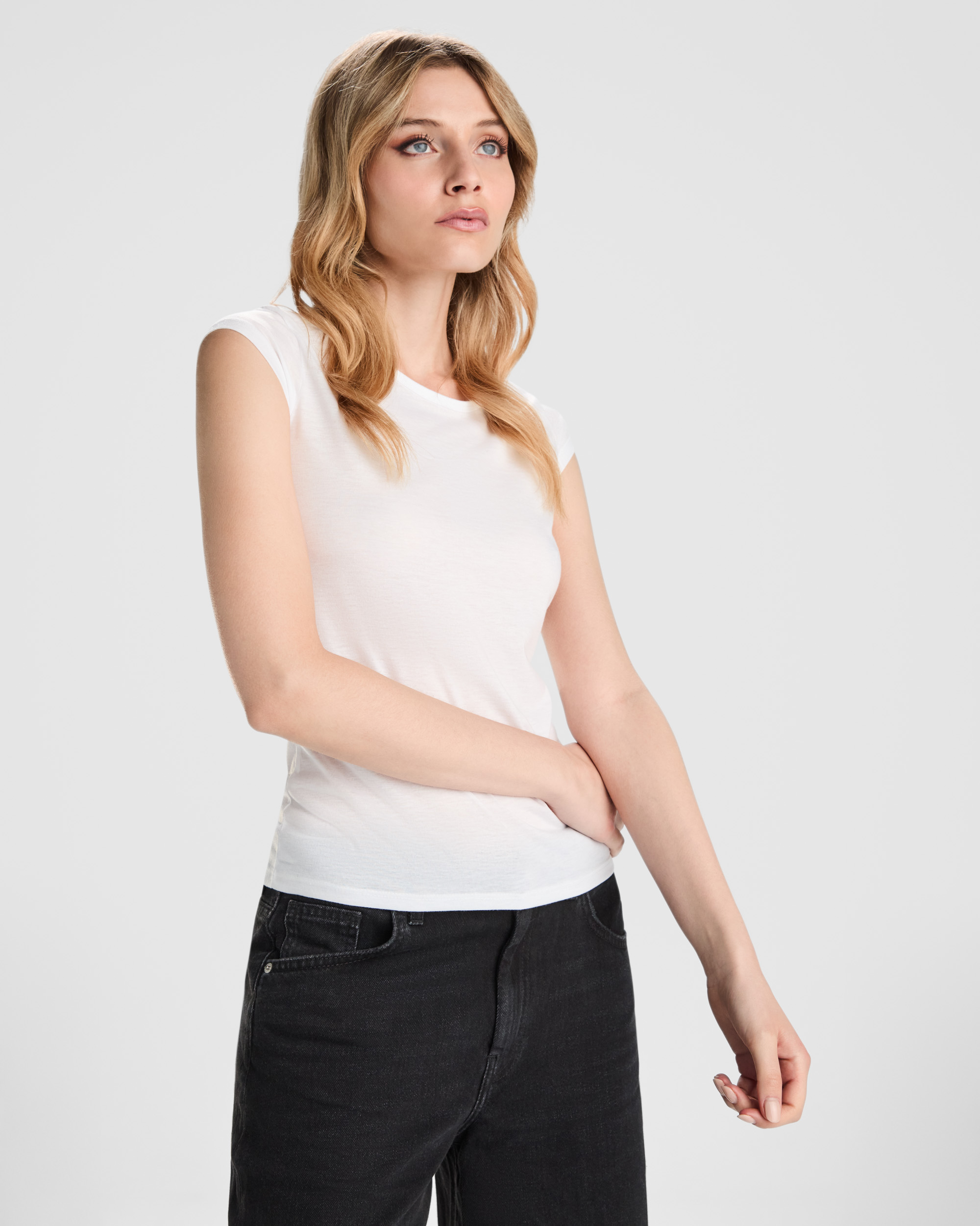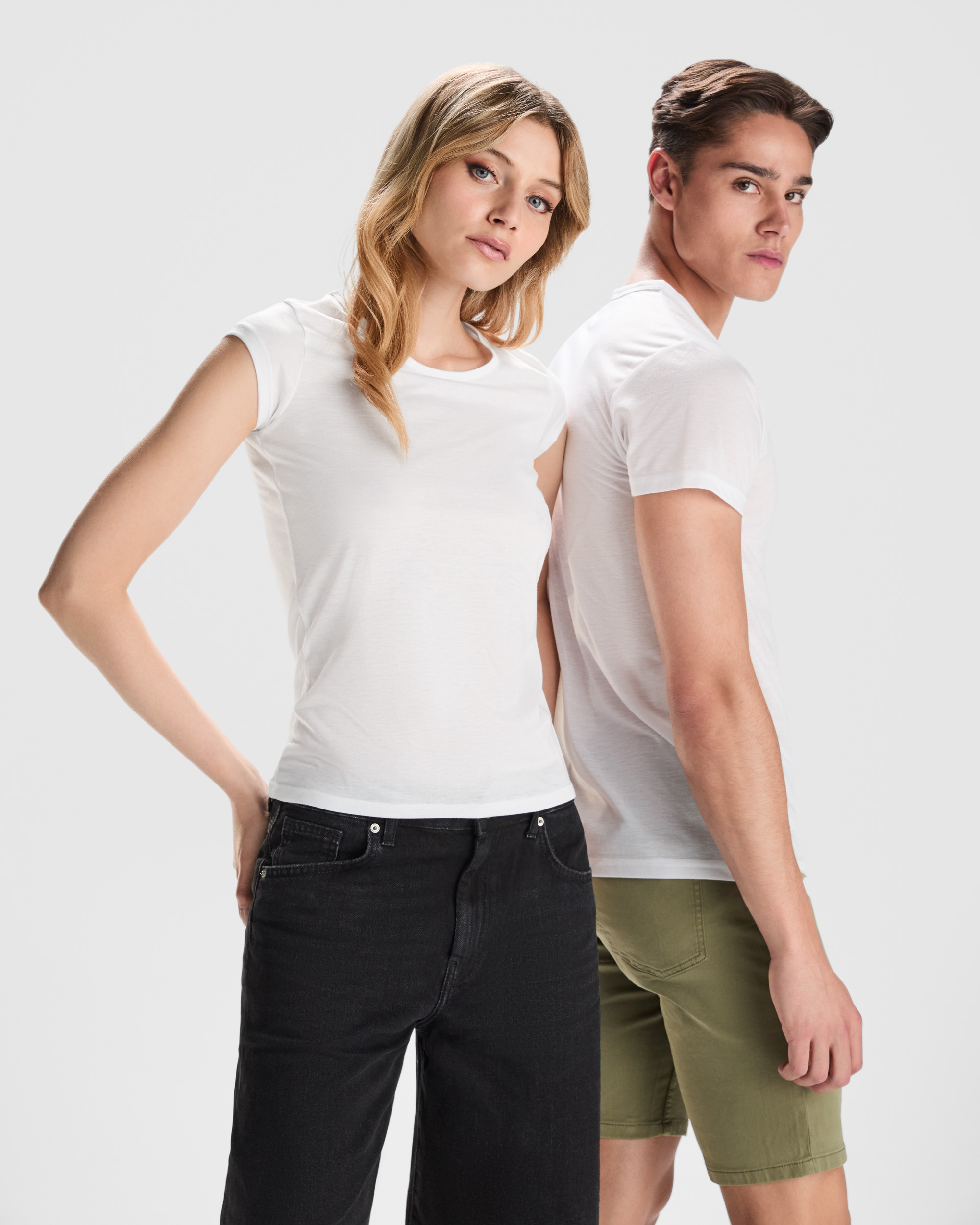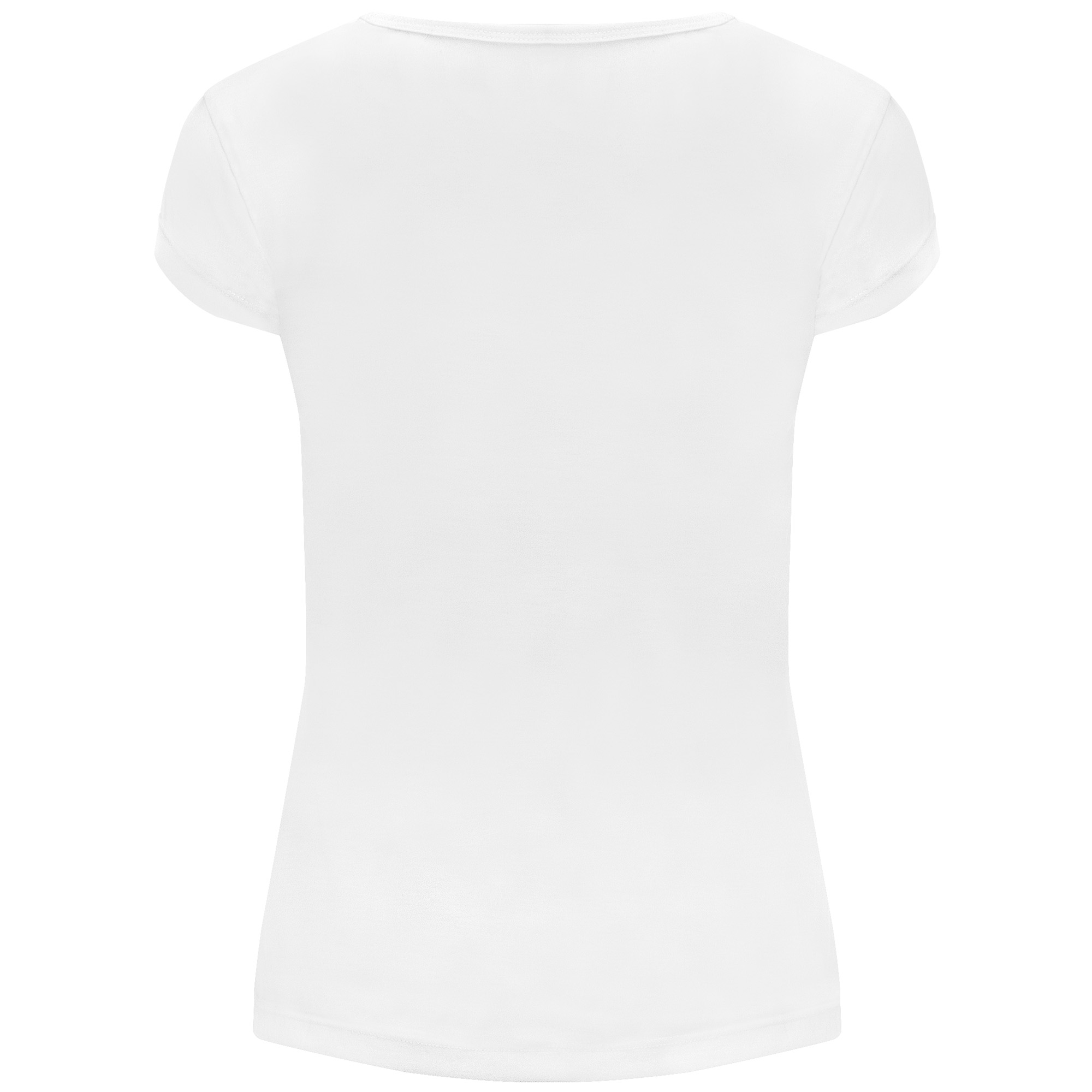 Camiseta de manga corta de poliéster tacto algodón entallada en cintura. Cuello redondo con ribete del mismo tejido.