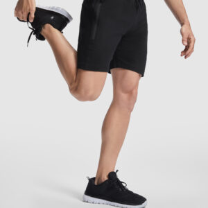 Pantalón corto deportivo interlock. Cintura engomada y cordón ajustable con ojales metálicos. Amplios bolsillos laterales con cremalleras invertidas al tono. Bolsillo trasero con botón a presión. Doble costura en bajo.Composición: 63% algodón / 37% poliéster, interlock, 270 g/m².Observaciones: *Etiqueta removible.