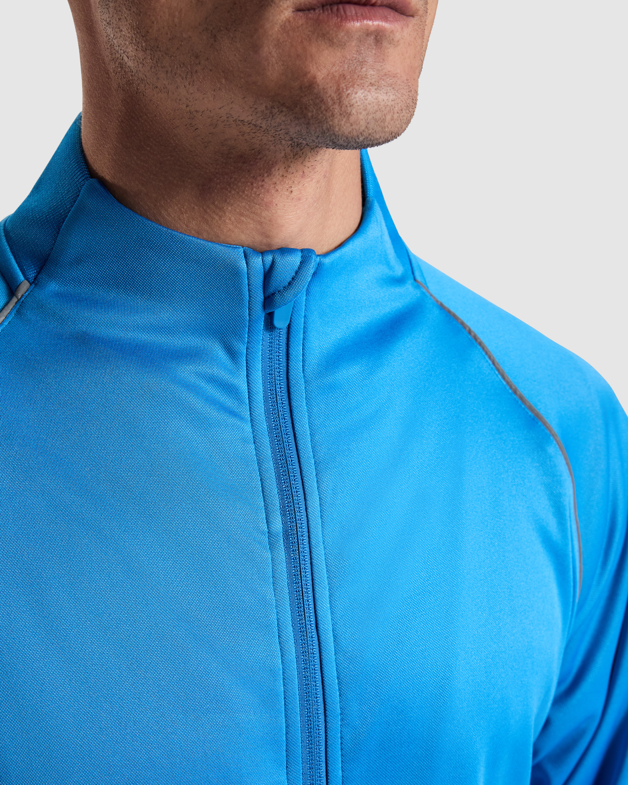 Sudadera deportiva manga ranglán de cuello alto y cremallera frontal. Rib 1×1 en bajo, cuello y puños. Cubrecosturas de tejido principal. Detalle en cuello trasero y puño en tejido principal. Vivo reflectante en sisa ranglán en delantero y espalda.
