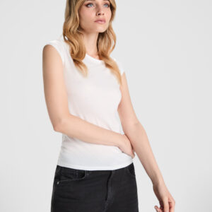 Camiseta de mujer sin mangas en punto canalé. Cuello y sisas con vivo ancho del mismo tejido, reforzado con doble costura. Bajo con doble costura.Composición: 95% algodón 5% elastano punto de canalé, 220 g/m²Observaciones: *ETIQUETA DE TALLA EN CUELLO Y EL RESTO EN EL LATERAL IZQUIERDO *TEJIDO STRETCH