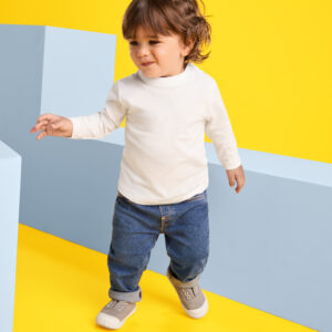Camiseta de manga larga de algodón peinado. Cuello redondo en canalé 1×1. Cierre con botones a presión en hombro hasta los 18 meses.Composición: 100% algodón peinado, punto liso, 160 g/m².Observaciones: *Etiqueta removible.