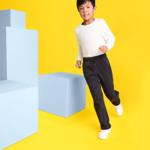 Pantalón largo entallado al tobillo. Cinturilla engomada con cordón ajustable y ojales metálicos. Bolsillos laterales con cremallera en tallas de adulto. Bolsillo extra grande insertado en costura lateral derecha con cremallera invertida. Cortes transversales a la altura del muslo. Puños en rib 1×1. Canesú trasero.Composición: 60% algodón / 40% poliéster, felpa no perchada, 280 g/m²….