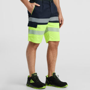 Bermuda multibolsillos bicolor de alta visibilidad. ·Tejido resistente. ·Cinturilla elástica en la parte trasera. ·Dos bolsillos frontales con detalles a contraste. ·Dos bolsillos traseros con tapeta y cierre de velcro con detalles a contraste. ·Dos bolsillos cargo con tapeta y cierre de velcro con detalles a contraste. ·Dos bandas segmentadas reflectantes en las piernas. ·Parte…